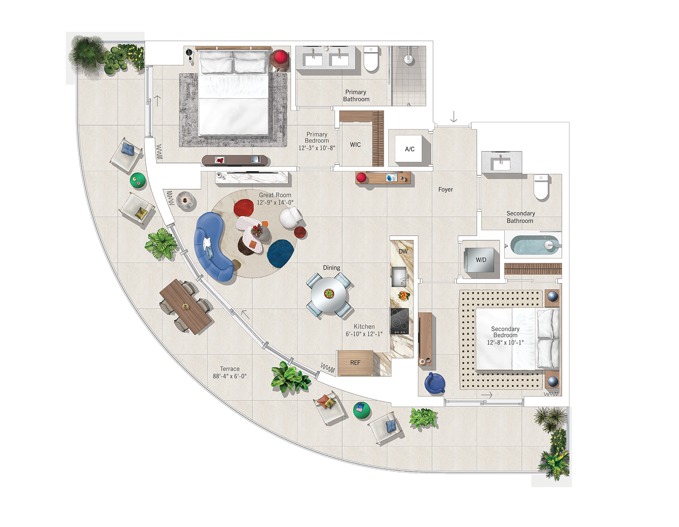 Bathrooms feature sleek Italkraft cabinetry, and kitchens match the elevated look with Italkraft cabinetry, integrated refrigeration, a quiet dishwasher, ceramic glass cooktop, and a built-in speed oven.